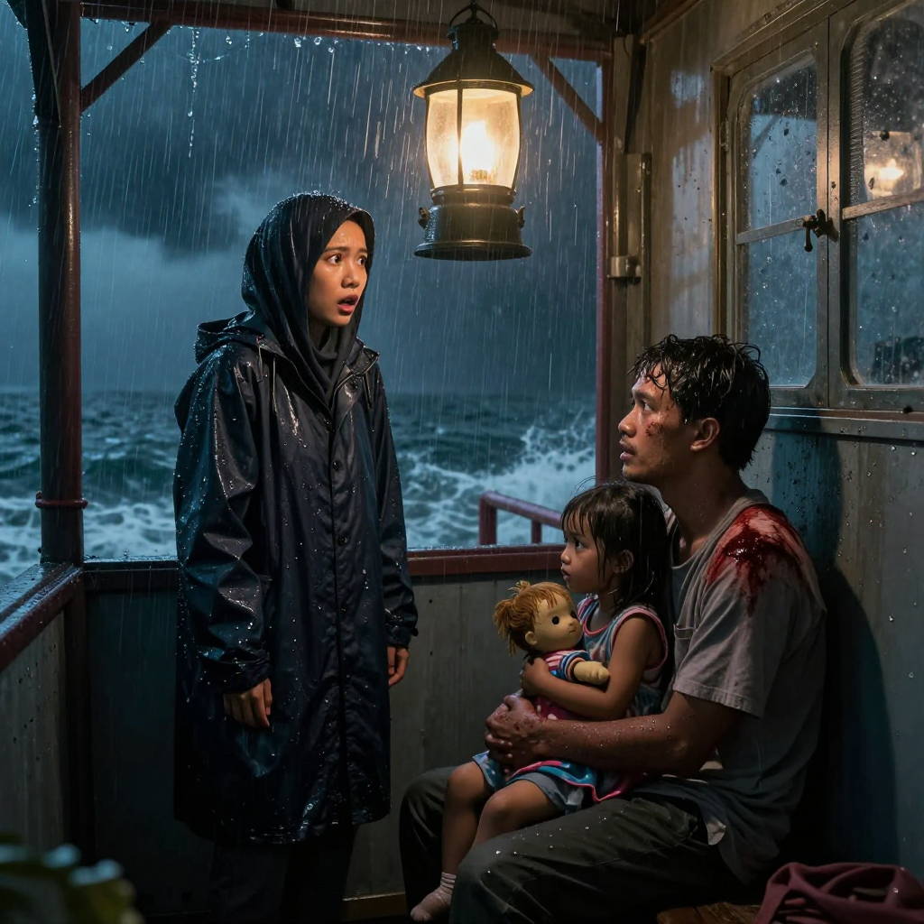 Pintu ruang lentera terbuka separuh. Di bawah cahaya besar yang masih berputar, seorang lelaki duduk bersandar pada dinding logam, bahunya berlumur darah. Dalam pelukannya ada anak perempuan kecil yang memegang boneka kain basah. Di lantai dekat kakinya tergeletak pisau lipat.